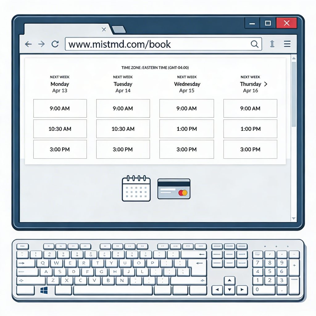 Book your MistMD service through our fully self-managed online scheduling platform. Secure your appointment with online payment and receive instant email confirmation.